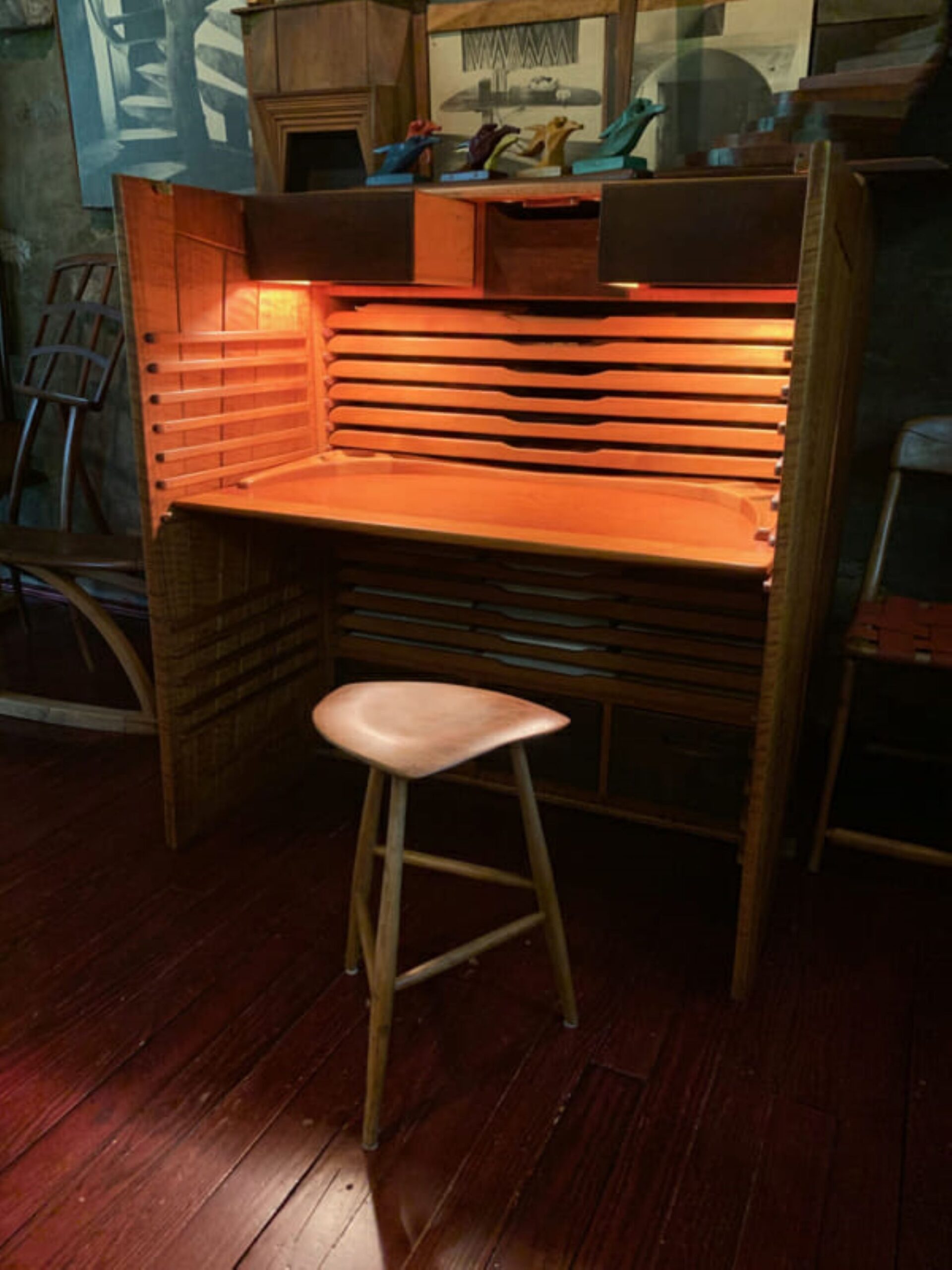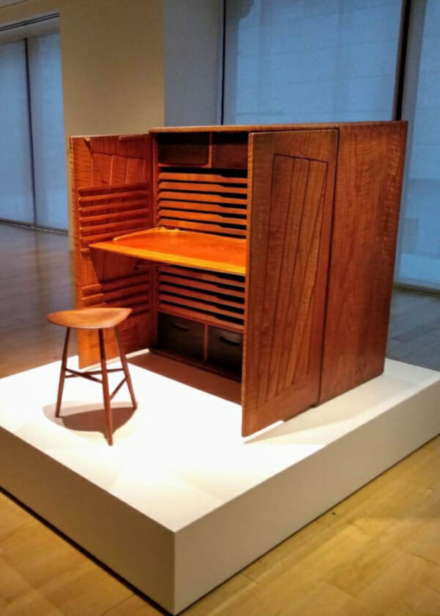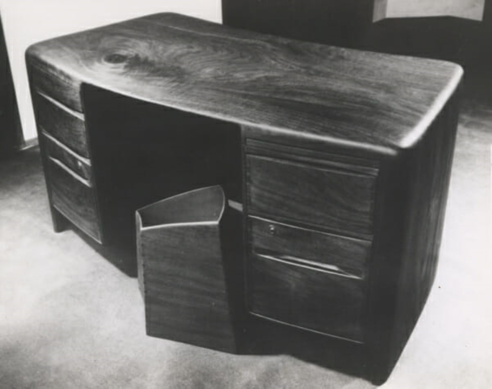 E későbbi, 1958-ban készült reprezentatív munkáján jól látszik az anyag természetes adottságainak kihasználása. Egy kabinet íróasztal, melyet saját, new yorki kiállítására készített. Ez volt az első olyan kiállítása, melyen egyedüli művészként jelentek meg munkái. A bútor olyan tölgyből készült, melynek hullámos mintázatú felülete az egyszerű formák ellenére a faanyag természetéből adódóan, mintha vibrálna a fényben. A felső fiókokban elektromos fényeket helyezett el, melyek azok kihúzásakor felkapcsolódnak. A hűtőszekrények világítása ihlette ezt a technikát, melyet a stúdió számos további helyén hasznosított. Emellett az egyik fiók kihúzva írófelületként is használható, így az asztal eredeti lapja rendezettnek tűnhet anélkül, hogy el kéne róla pakolni, felborítva a munkafolyamatokat.
