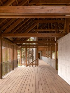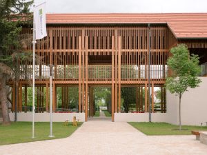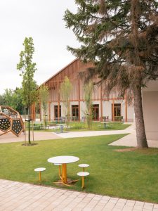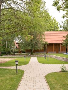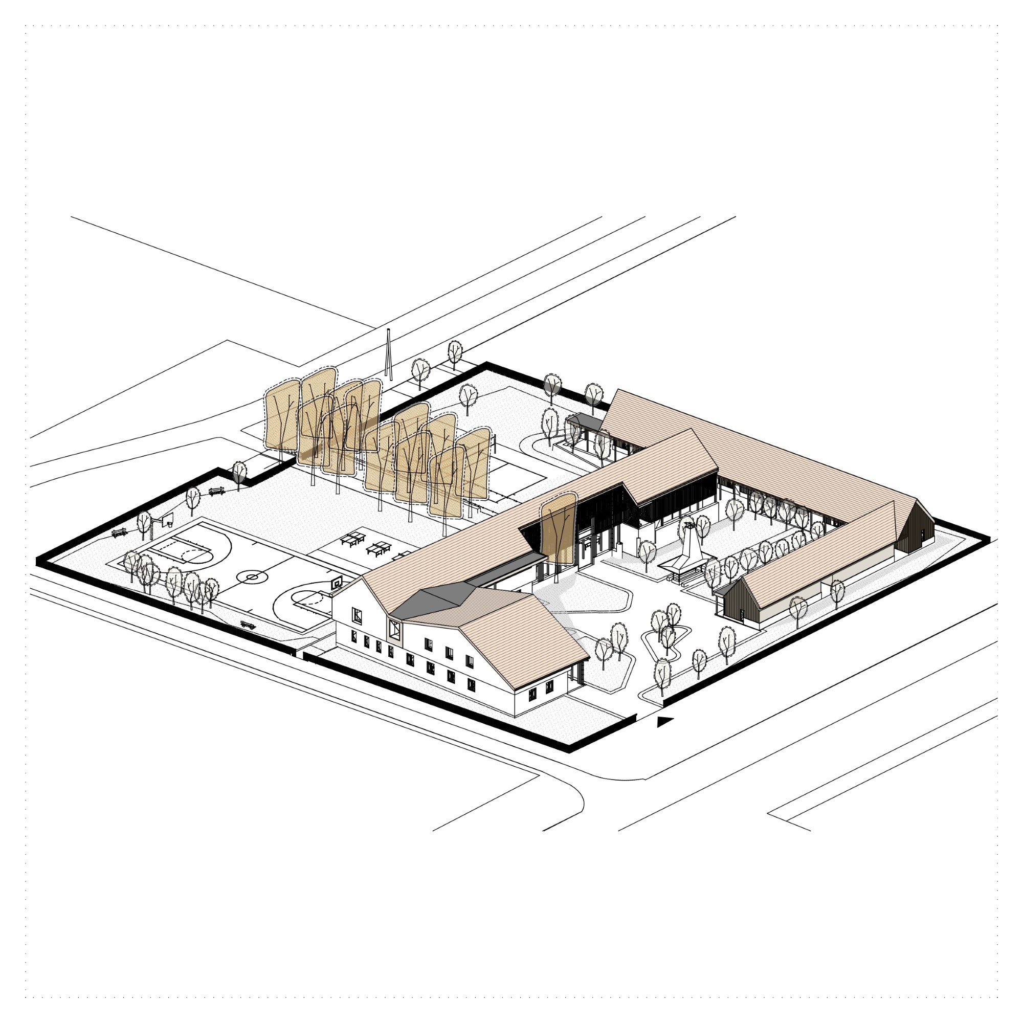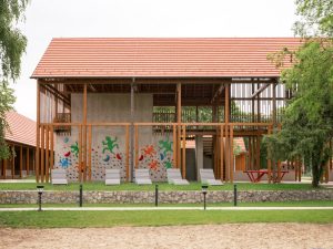 Az egyes tömbök léptéke szinkronban van a használóikkal: a felnőttek uralta főépület a legrobusztusabb, a csűr szellősebb és emberléptékűbb, míg az ifjúsági szárny már minden dimenziójában visszalép a gyerekek szintjére.  A gyermeki lélek egyszerű, ösztönösen természetbe vágyó. Ezt a képletet követi az anyaghasználat és részletképzés is: a főépület domináns törtfehér vakolatától és homokszínű lábazatától, a csűr fa hangsúlyain át eljutunk a gyermekek teljesen fa szerkezetű, tiszta és természetközeli szállásaihoz.
