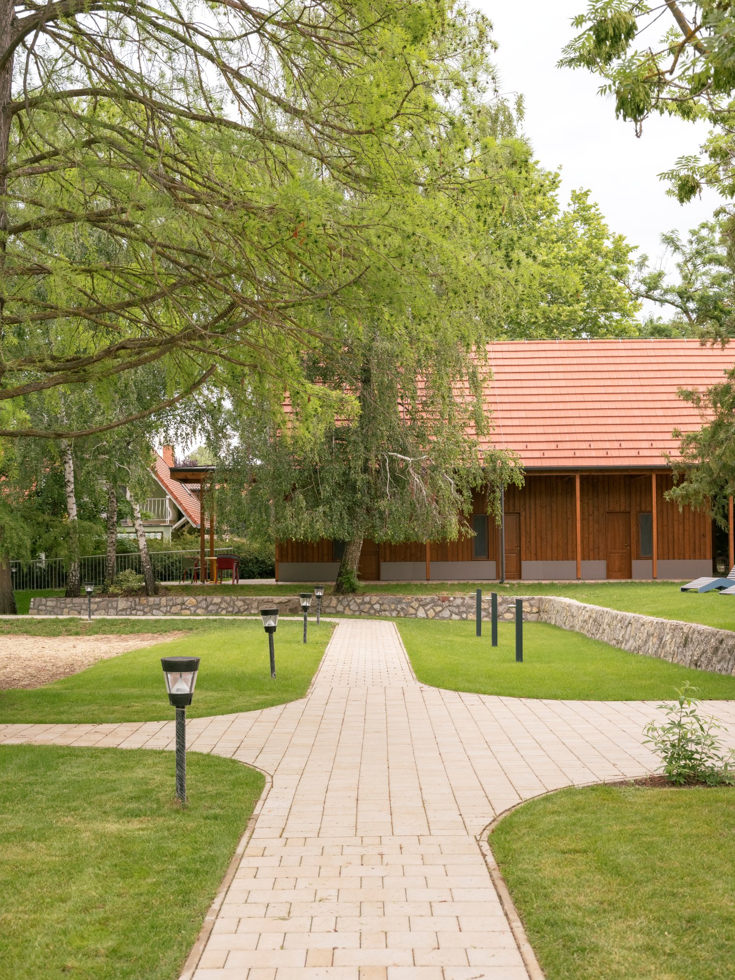 A szántódi tábor egyik legnagyobb erénye az illeszkedés: az épület annyira szerves része a teleknek, a fáknak és az udvarnak, hogy azok nélkül értelmezhetetlen lenne. Nem az utcakép a lényege, hanem a terek használhatósága.