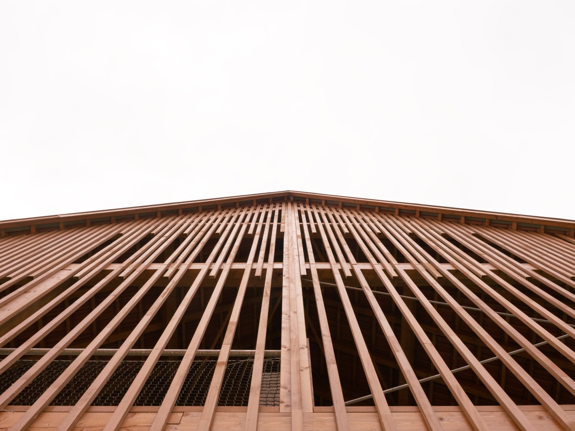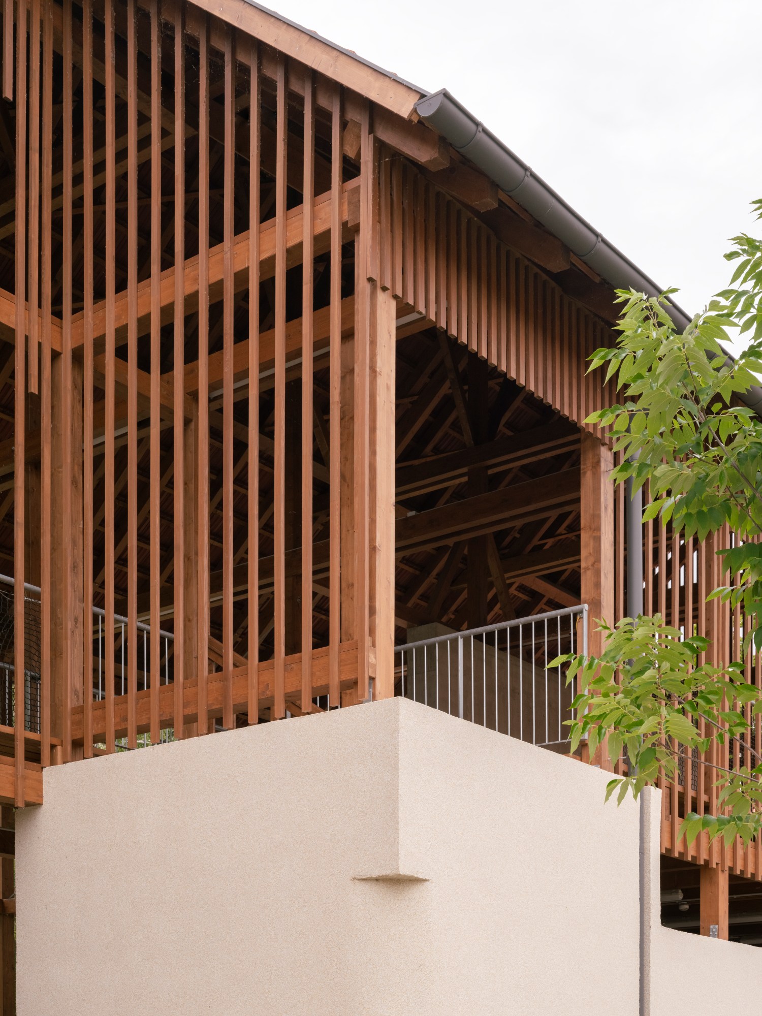 Az együttes nem akarja túllicitálni a természetet. A fa homlokzati lamellák ritmusa és mintája éppen annyit ad hozzá az összképhez, amennyi a dinamikához kell, anélkül, hogy túlgondoltnak éreznénk.