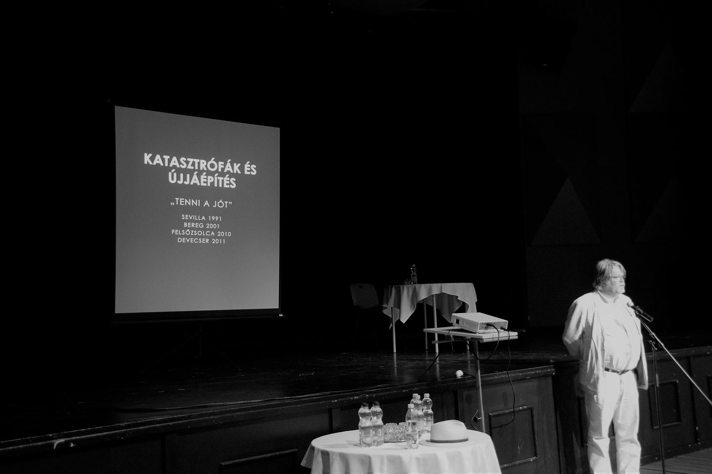 Turi Attila előadása (Katasztrófák és újjáépítés) a sevillai pavilon építéséről, a KKE és a Vándoriskola beregi- , borsodi árvízi, és a vörösiszap-katasztrófa utáni munkájáról szólt, kiemelve az építészeti feladatokon túl a közösségépítés felelősségét is.