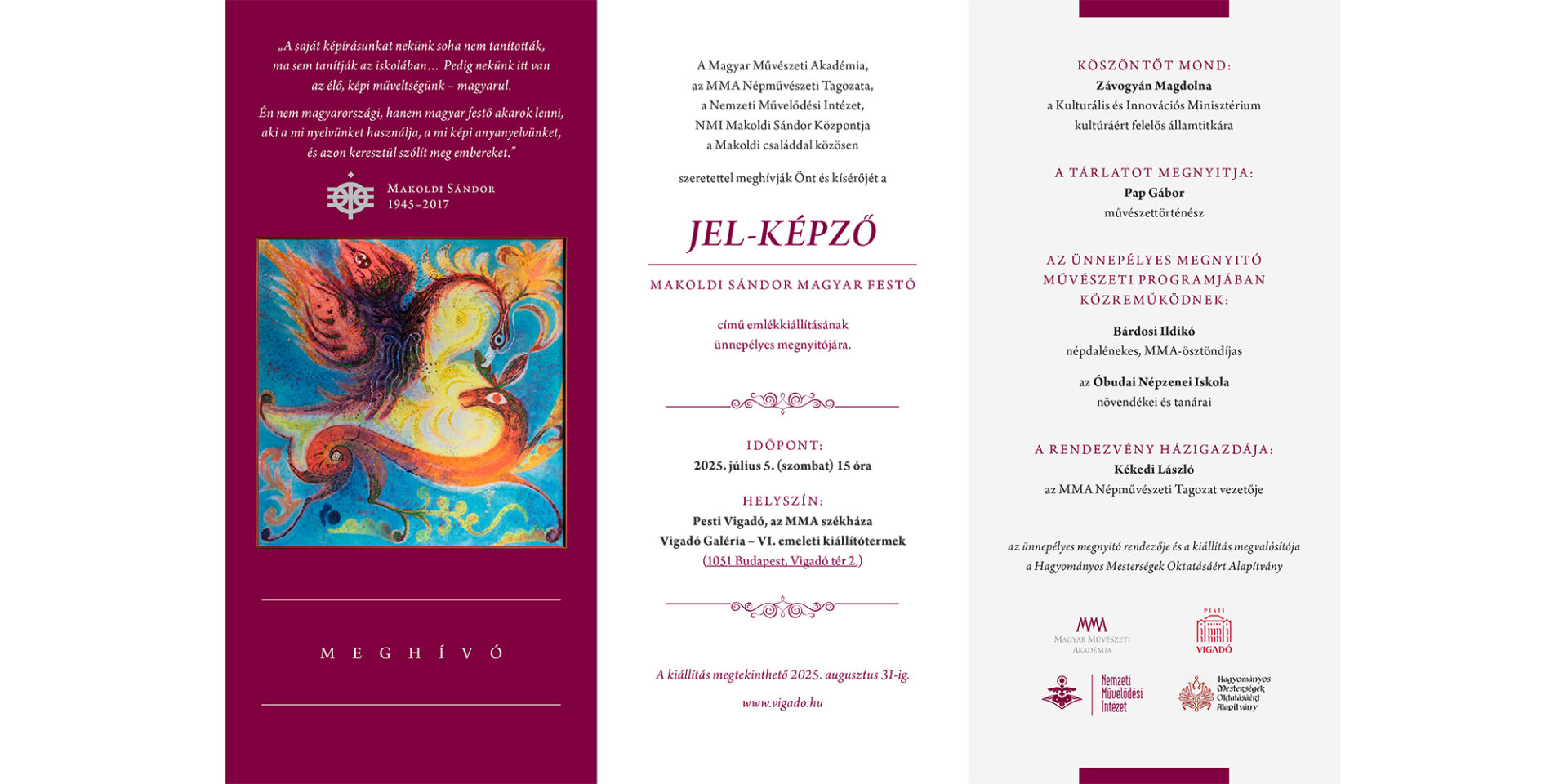 A Magyar Művészeti Akadémia, az MMA Népművészeti Tagozata, a Nemzeti Művelődési Intézet és a NMI Makoldi Sándor Központja közös szervezésében valósul meg a ‘JEL-KÉPZŐ – Makoldi Sándor magyar festő’ című emlékkiállítás.