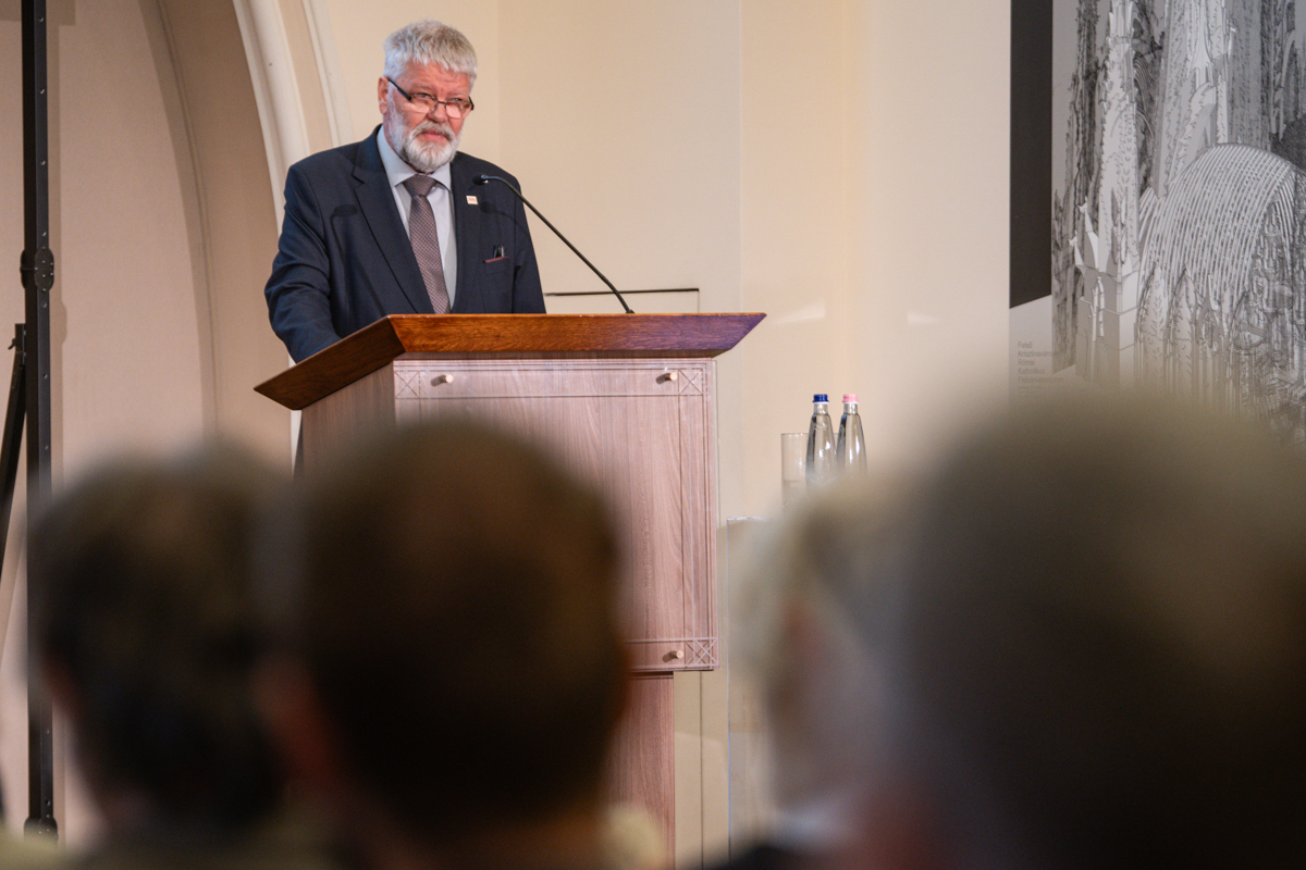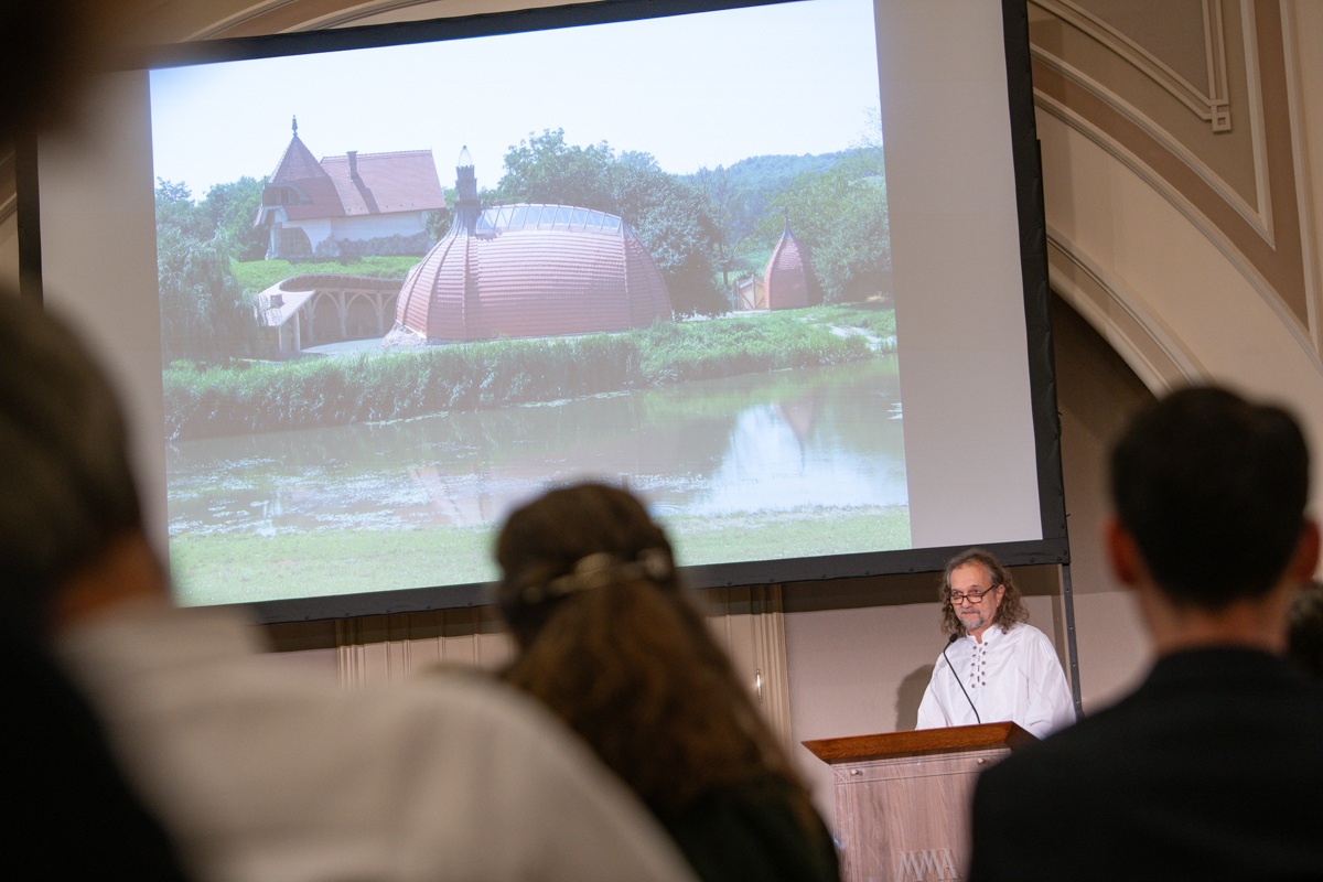 Turi Attila (a Magyar Művészeti Akadémia elnöke) köszöntőjében Makovecz Imre gondolatát hozta a hallgatóság elé: „Az építész isteni terv szolgálója, műveivel megkísérli az ember lehetséges útját kijelölni. Magát és társait kell az angyali lét felé emelnie…” Felidézte a magyar organikus építészet negyven évvel ezelőtti bemutatkozását a Magyar Élő Építészet kiállításon, emlékeztetve, hogy a történelmi időtávlat ellenére ember és környezet viszonya nem változott, az emberi munka lényege ma is „a láthatatlan rend megidézése” (Hamvas Béla). A Makovecz Imre által kijelölt utat részletezve kitért az ezen járó építészek fő vezérlő elveire – hasznos és gyógyító építészet művelése, közösség- és hálózatépítés, főépítészi munka –, és feladatként jelölte ki ezen iniciatívák lefordítását a 21. század nyelvére.