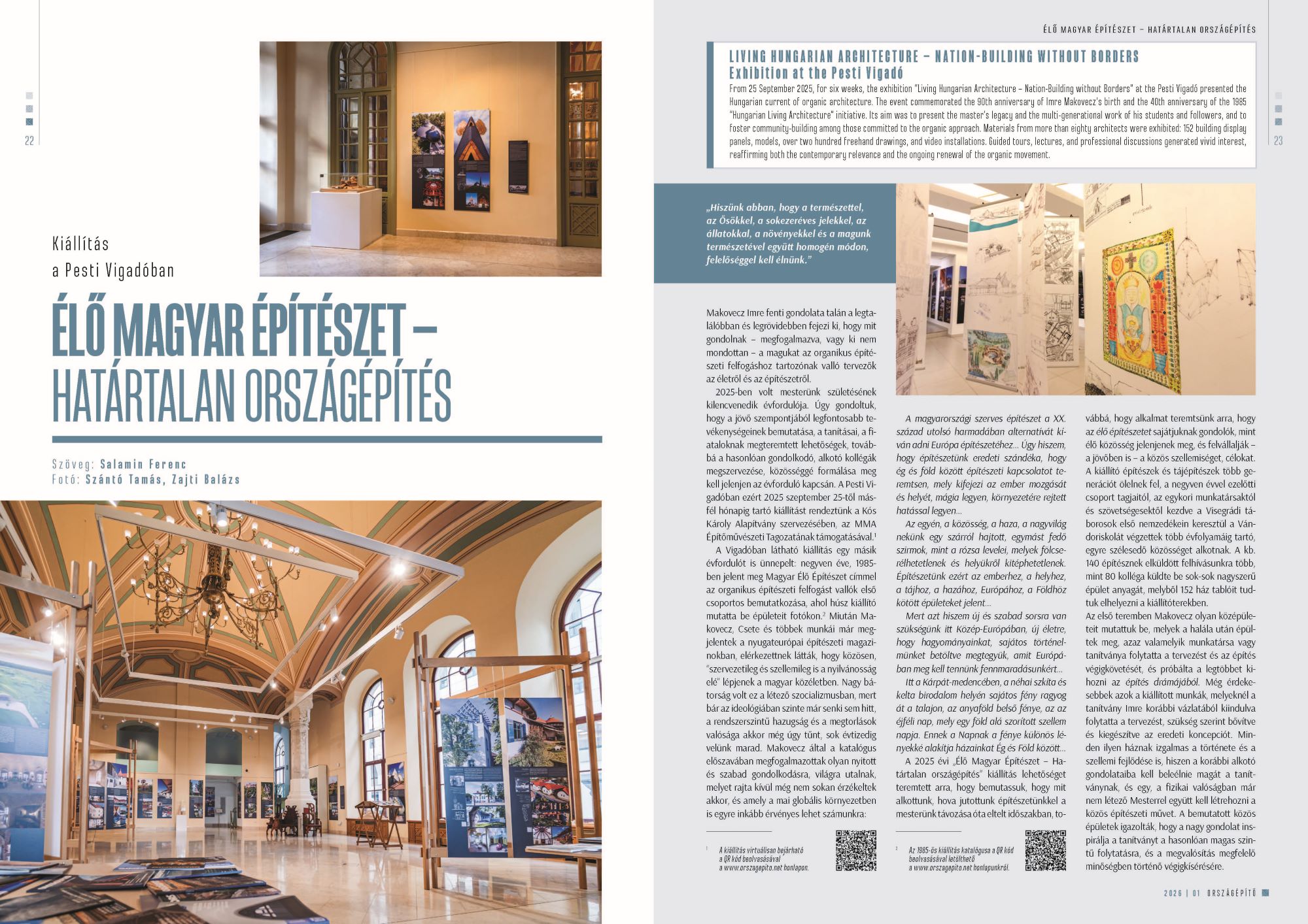 Idei évtől az Országépítő folyóirat lapbemutató esteket szervez az MMA Akadémiai Szalonjában (1034 Budapest, Makovecz Imre utca 25). A délután 5 órakor kezdődő lapbemutató célja, hogy bemutassuk az adott lapszám cikkeit, egy-egy kiemelkedően fontos épületet kisfilm segítségével az építtetők, tervezők oldaláról is megismerjünk, majd egy kerekasztal beszélgetésben megvitassuk korunk néhány fontos társadalmi, építészeti kérdését.