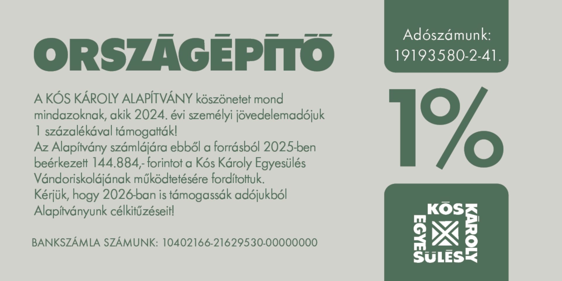 A KÓS KÁROLY ALAPÍTVÁNY köszönetet mond mindazoknak, akik 2024. évi személyi jövedelemadójuk 1 százalékával támogatták! Az Alapítvány számlájára ebből a forrásból 2025-ben beérkezett 144.884,- forintot a Kós Károly Egyesülés Vándoriskolájának működtetésére fordítottuk.