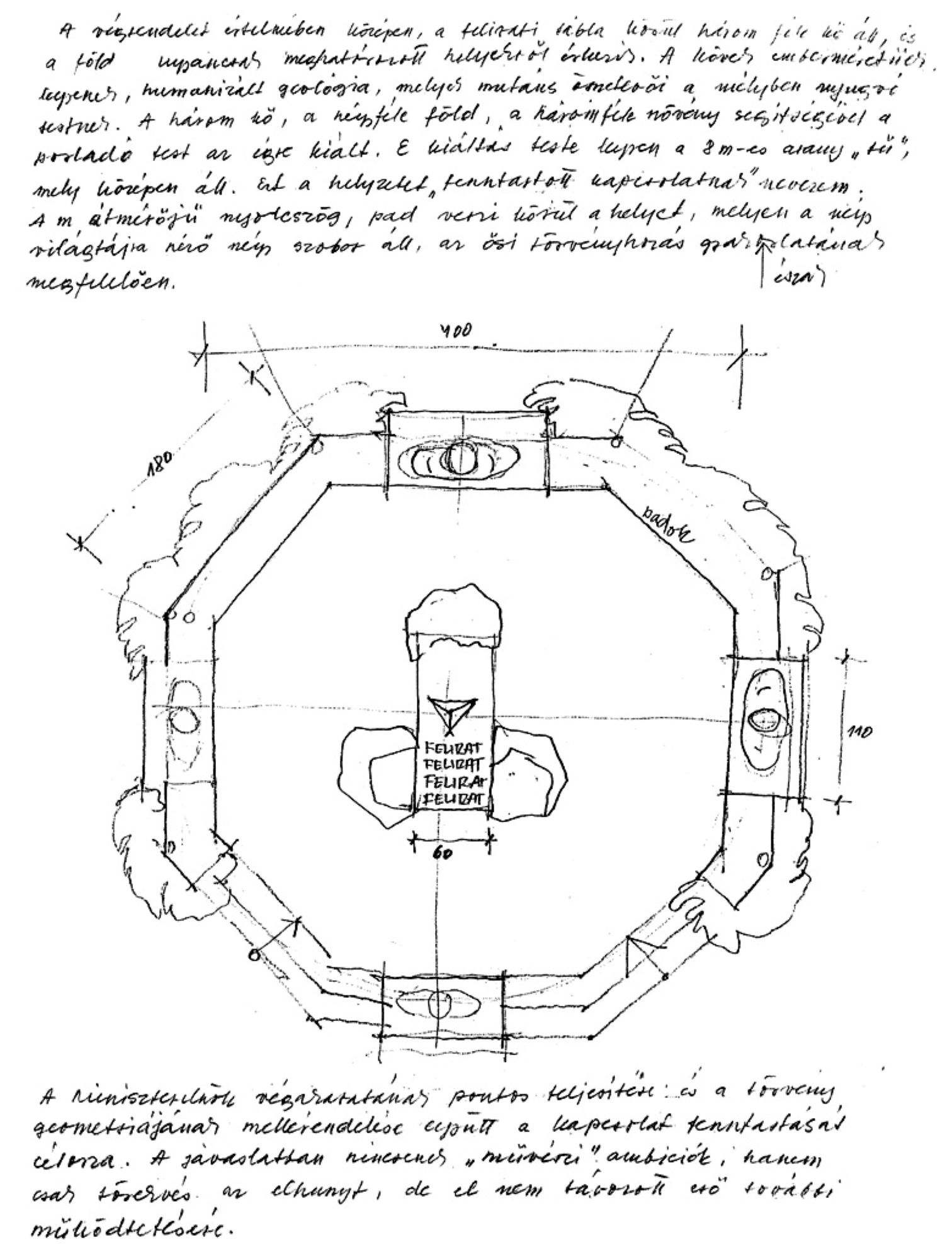 Az Antall-síremlék első vázlatait még Makovecz Imre vetette papírra. Az elgondolás már akkor is középpontos szerkesztésű volt (összhangban Antall József végrendeletével), négy különböző irányba néző szoboralakkal körülállva, az építészet és szobrászat elemeit egyensúlyban tartva. A végül megvalósult emlékmű, Melocco Miklós drámain gyönyörű szoborcsoportja is a négy irányt veszi fel, épületszerű falat létrehozva a sírhant körül, de az építészet elemei itt már hiányoznak, vagy eljelentéktelenedtek.